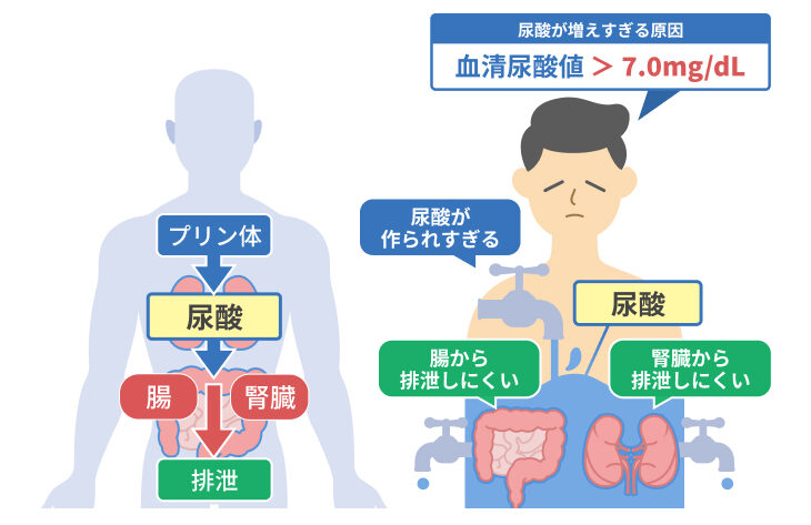 しかし、尿酸が過剰に作られたり、体の外への排出がうまくできなかったりすることで、体の中に溜まってしまうのです。