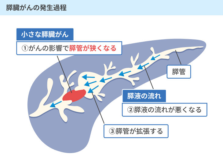 そして、膵臓がんは多くの場合、膵管に発生し、がん細胞が成長することで、膵管が圧迫され、膵液の流れが悪くなってしまうのです。