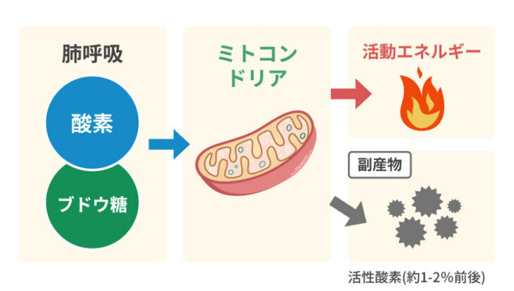しかし、エネルギーを作り出す過程で、活性酸素と呼ばれる物質も副産物として生じてしまいます。