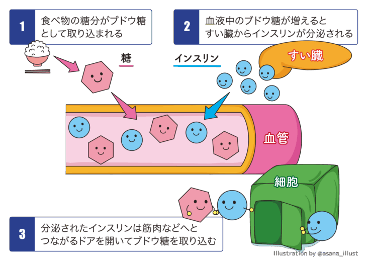 インスリンは、血液中のブドウ糖が細胞に取り込まれるのを促すはたらきがあるほか、余分なブドウ糖を筋肉や脂肪に蓄える役割を担うホルモンです。