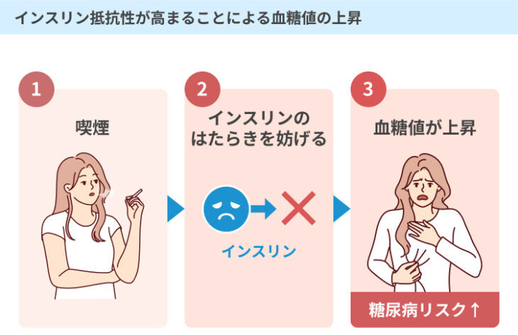 これは、タバコに含まれる成分が血糖値のコントロールに悪影響を及ぼすことに原因があります。